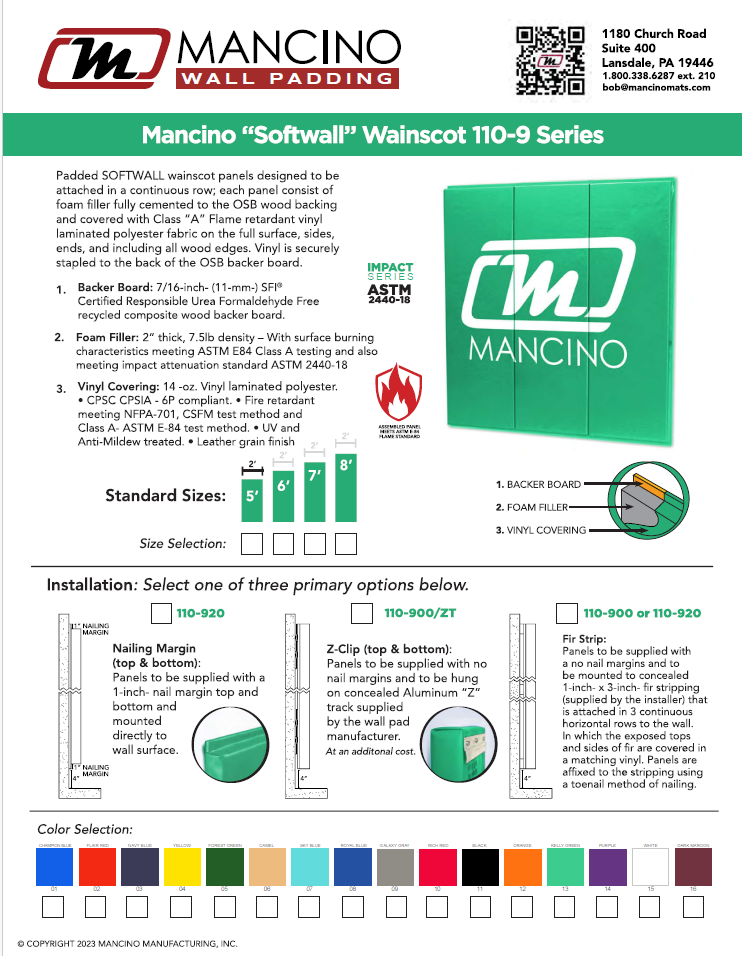 This premium Mancino “FIREWALL” wall padding panel, has taken safety to whole new level. This panel has been tested and passed for both the ASTM Class “A” fire rating standard ASTM-E84 and by utilizing extra firm polychloroprene latex compound foam it also has also been tested and passed ( with ratings below 1000 HIC and below 200g max) to meet the ASTM 2440-18 Impact testing standard.