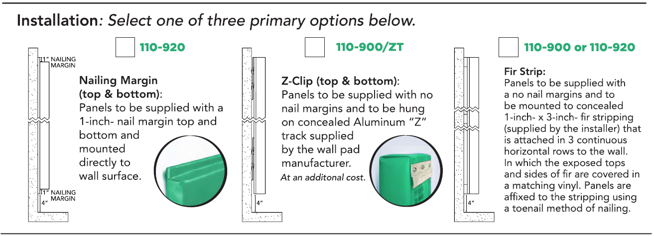 • Option 2 – Panels to be supplied with a no nail margins and to be hung on concealed Aluminum “Z” track supplied by the wall pad manufacturer.