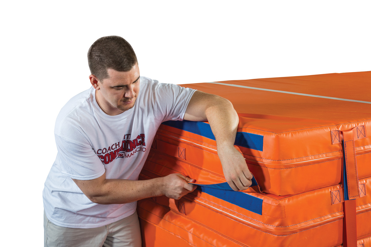 Our three-piece system consists of one 32″ x 5′ x 10′ lattice-style pit and two each 8″ x 5′ x 10′ Landing Mats to provide the required 32″ , 40″ and 48″ height landing surfaces. Each top surface is screen prined with the required 32″ stripe. Our “side strap attaching system” allows for safe and solid top stacking. All pieces are covered in premium 18oz vinyl with full “Breather Mesh” sides to allow for maximum air expulsion. We’ve chosen a slightly softer prime polyurethane foam filler for a more comfortable, flat back fall. Use these versatile pieces separately throughout your gym! Available as a three mat system or sold individually. Your color choice. Complete 3 Piece System