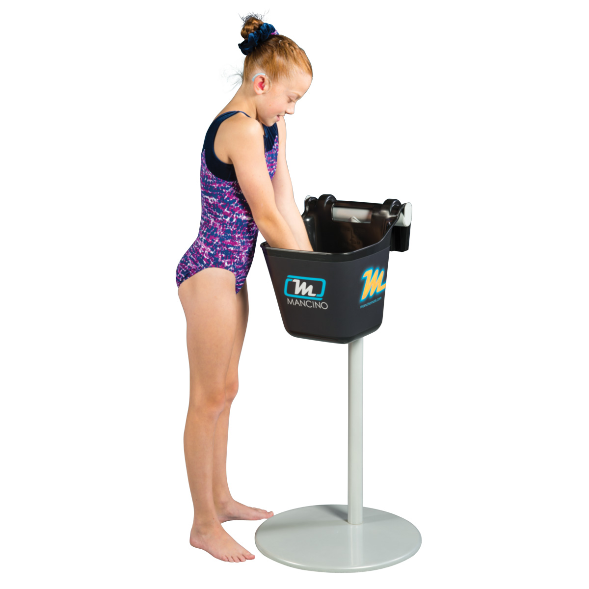 The Mancino chalk stand has been engineered to prevent tipping when several athletes are huddled around getting chalked up for competition. The bucket is also easily removed to chalk up high bars or rings.