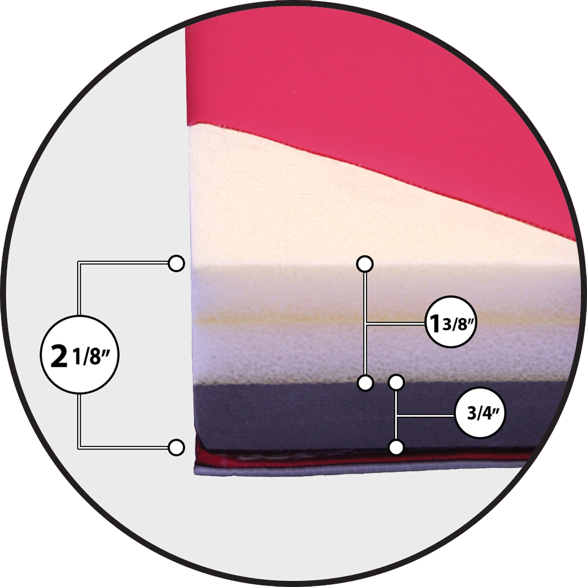 Combination of 1 3/8” cross-linked polyethylene foam as a top layer and a 3/4″ EVA mini-cell polyethylene foam as a bottom layer. This combination allows the working surface of the mat to remain firm for excellent footing while the 3/4″ EVA provides some spring for moves that require push-off. Also gives some extra cushioning for awkward falls. This is Mancino’s premium mat combination and can be safely used by children through adults.